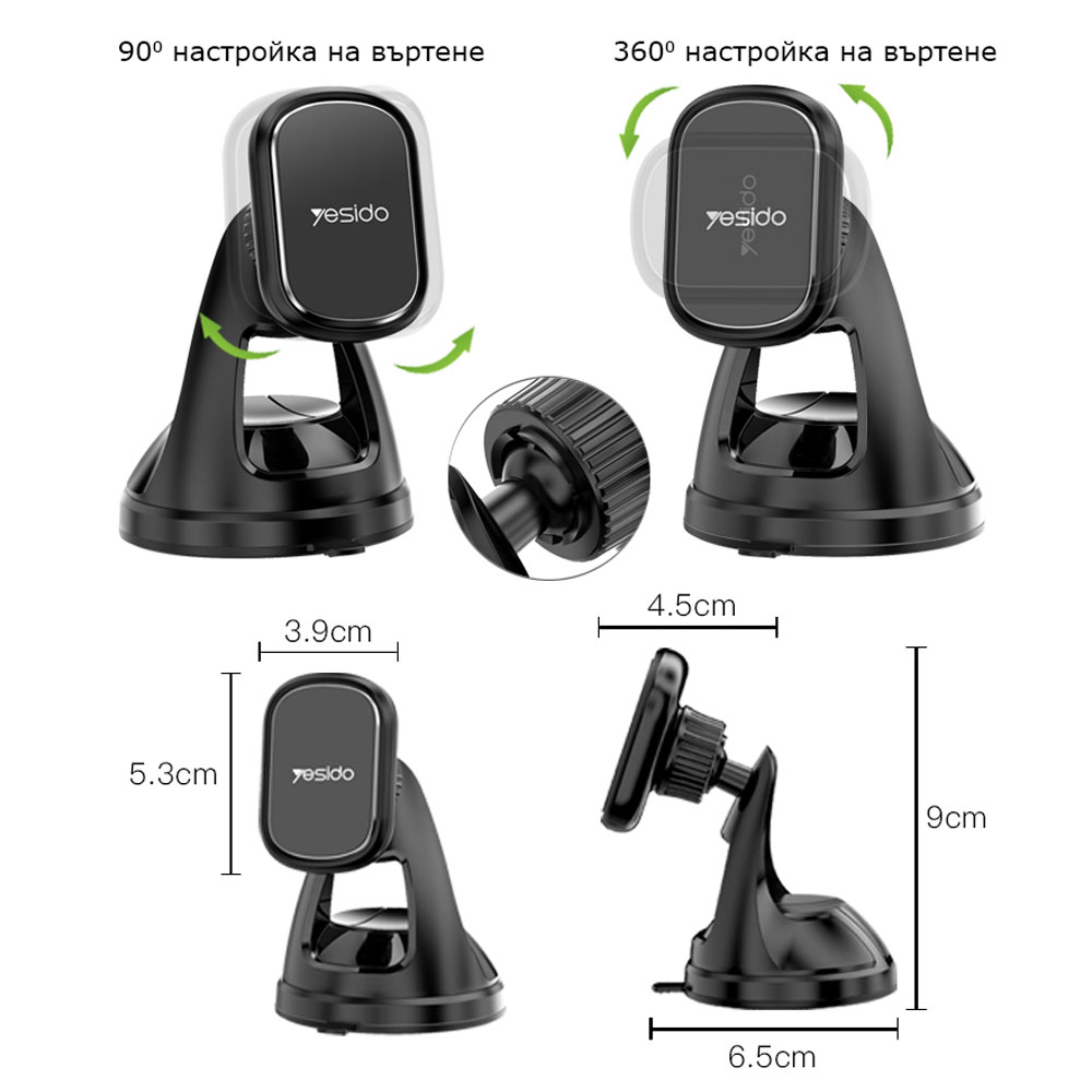 Allows 90° horizontal adjustment and 360° vertical adjustment. If the suction cup becomes dirty, clean it with water, wait for it to dry and it will regain its elasticity.