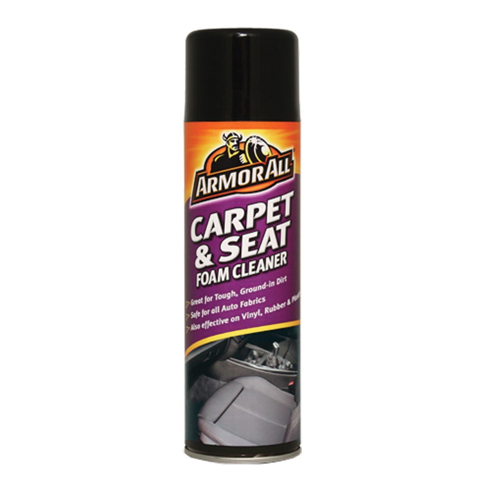 WHERE TO USE Also effective on: Fabric and vinyl seats; Rubber and plastic; Carpets and floor mats; Dashboards and door panels; Vinyl tops and headliners USAGE DIRECTIONS: Shake well before use. Spray directly on surface to be cleaned. Allow to penetrate briefly. For fabrics and carpets, scrub with a damp cloth or sponge. For other surfaces, rinse or wipe off with a damp cloth. Do not allow to dry on surface. Rinse spills and runoff. ATTENTION! Test first on an inconspicuous area. Care should be taken not to use Carpet and Seat Foaming Cleaner on leather interiors – we recommend Armor All Leather Care Gel or Armor All Leather Wipes for these surfaces.