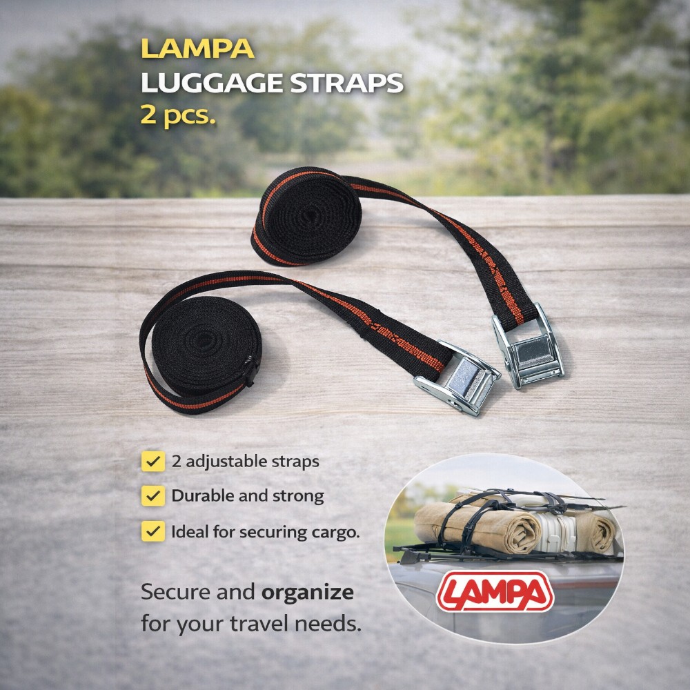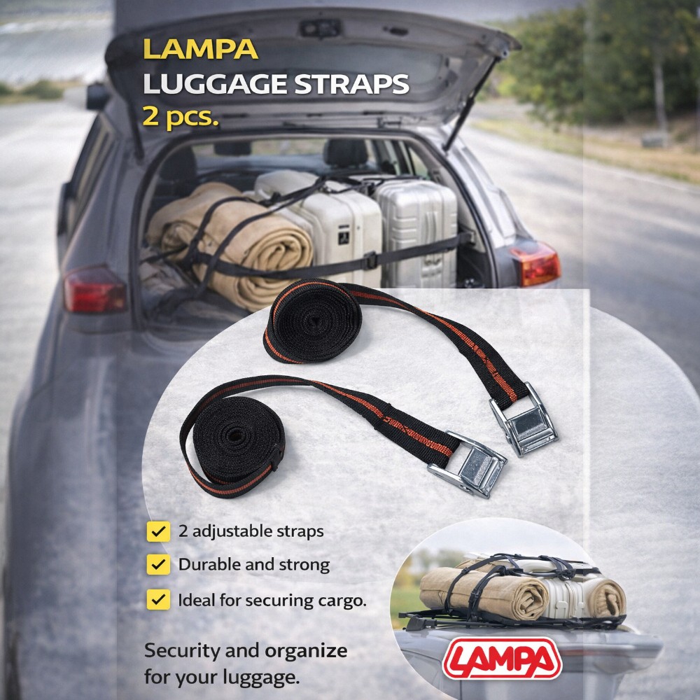 The LAMPA set includes two high-quality straps designed for secure and reliable fastening of luggage or cargo during transport. Made from durable material and equipped with a strong buckle, they ensure stability and safety even on long journeys.