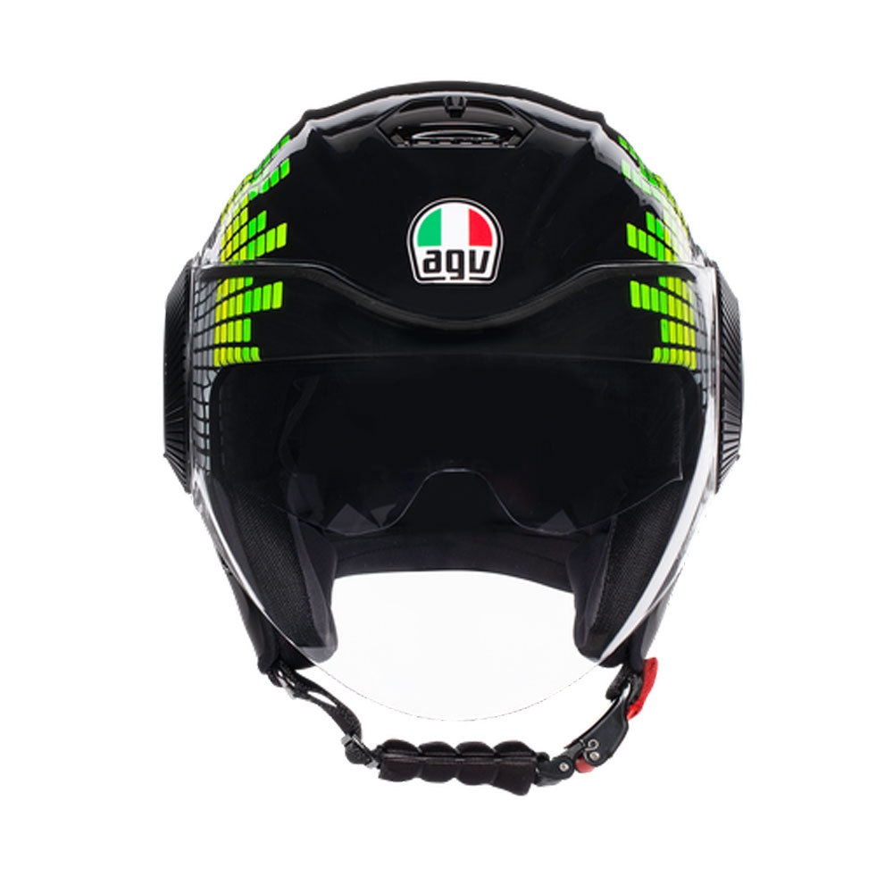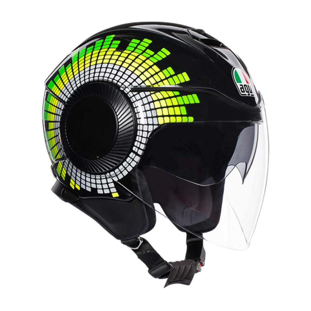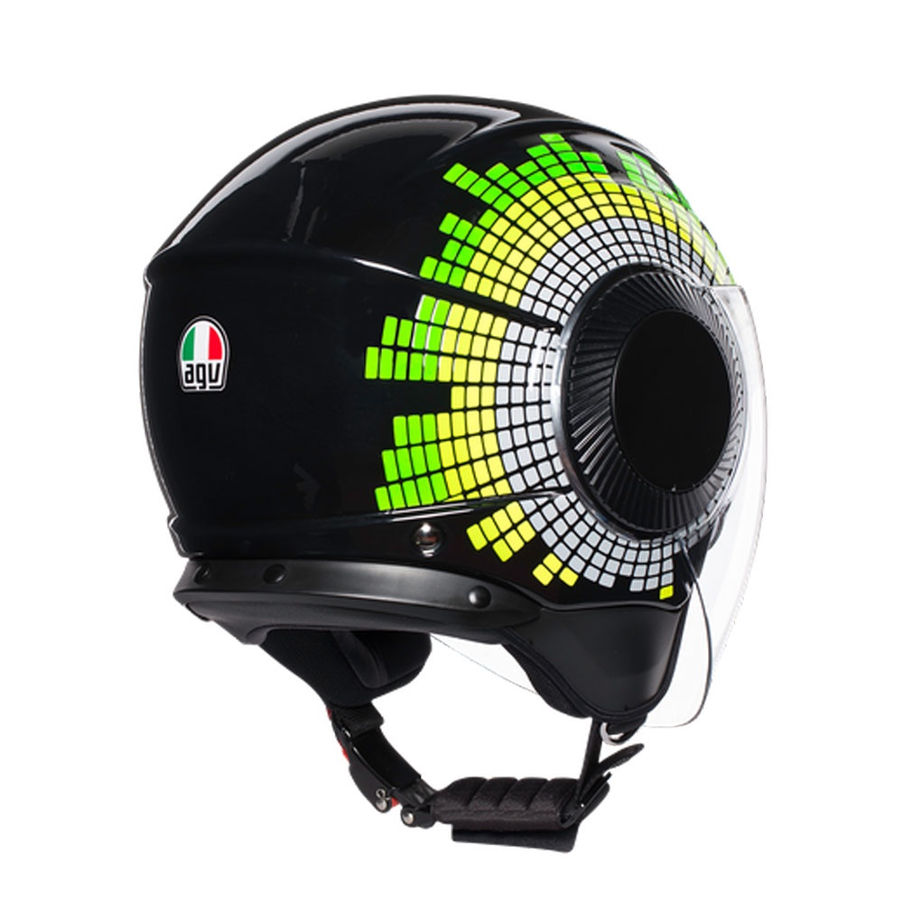 Orbyt is the ultimate AGV jet helmet, designed for maximum comfort, freedom and protection in the urban environment. Graphic: GINZA BLACK/YELLOW/GREEN.