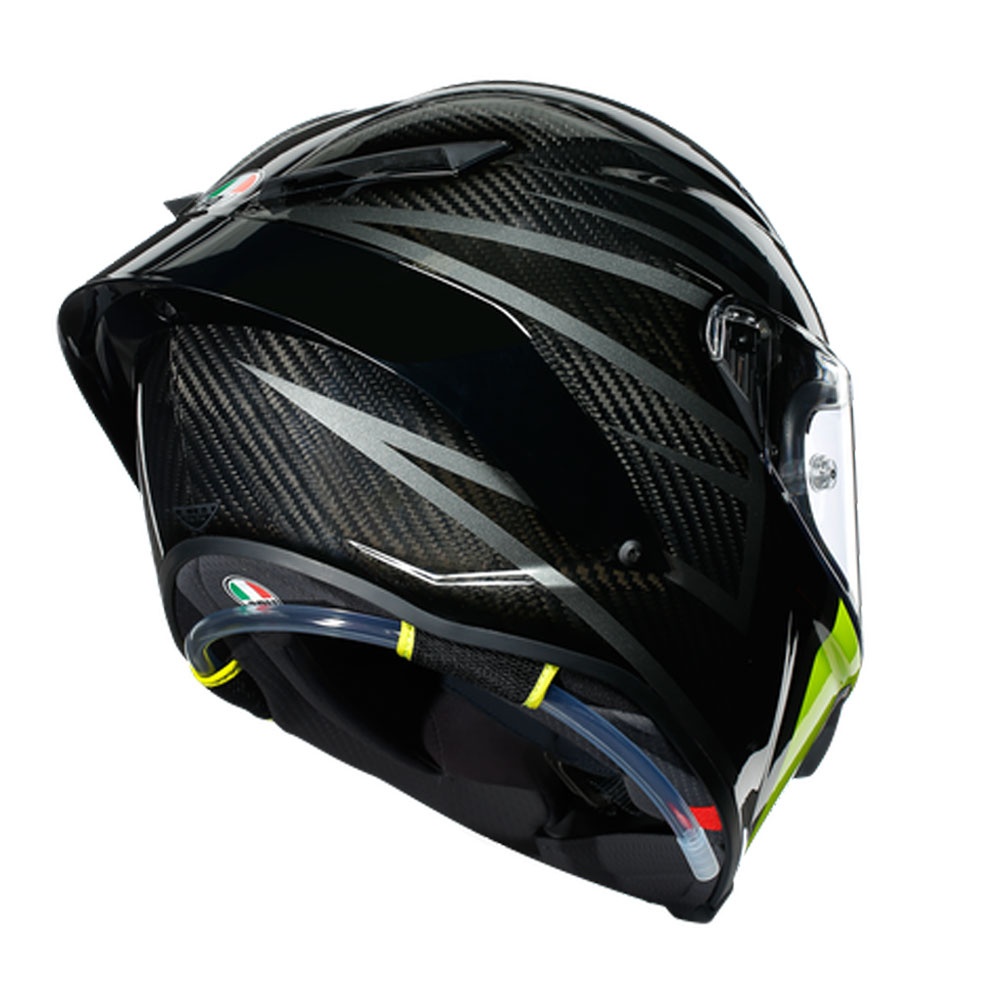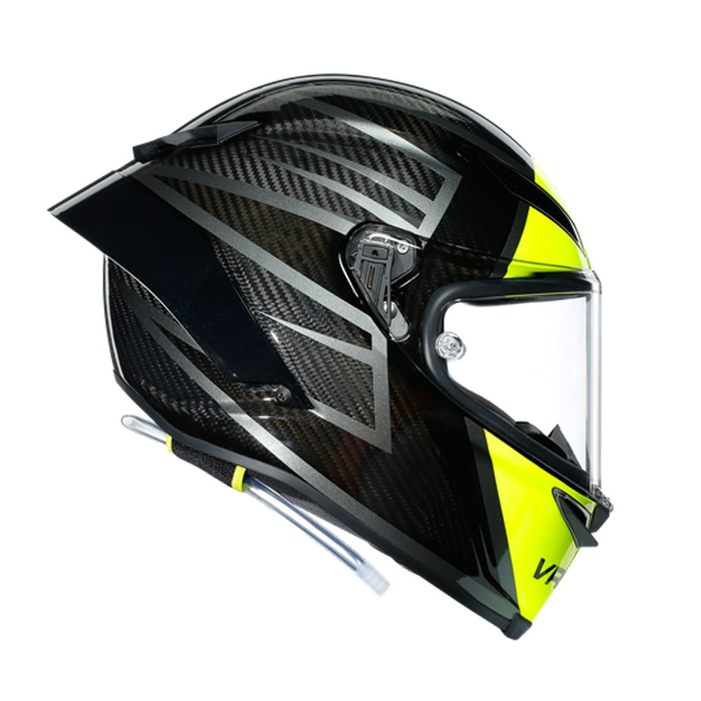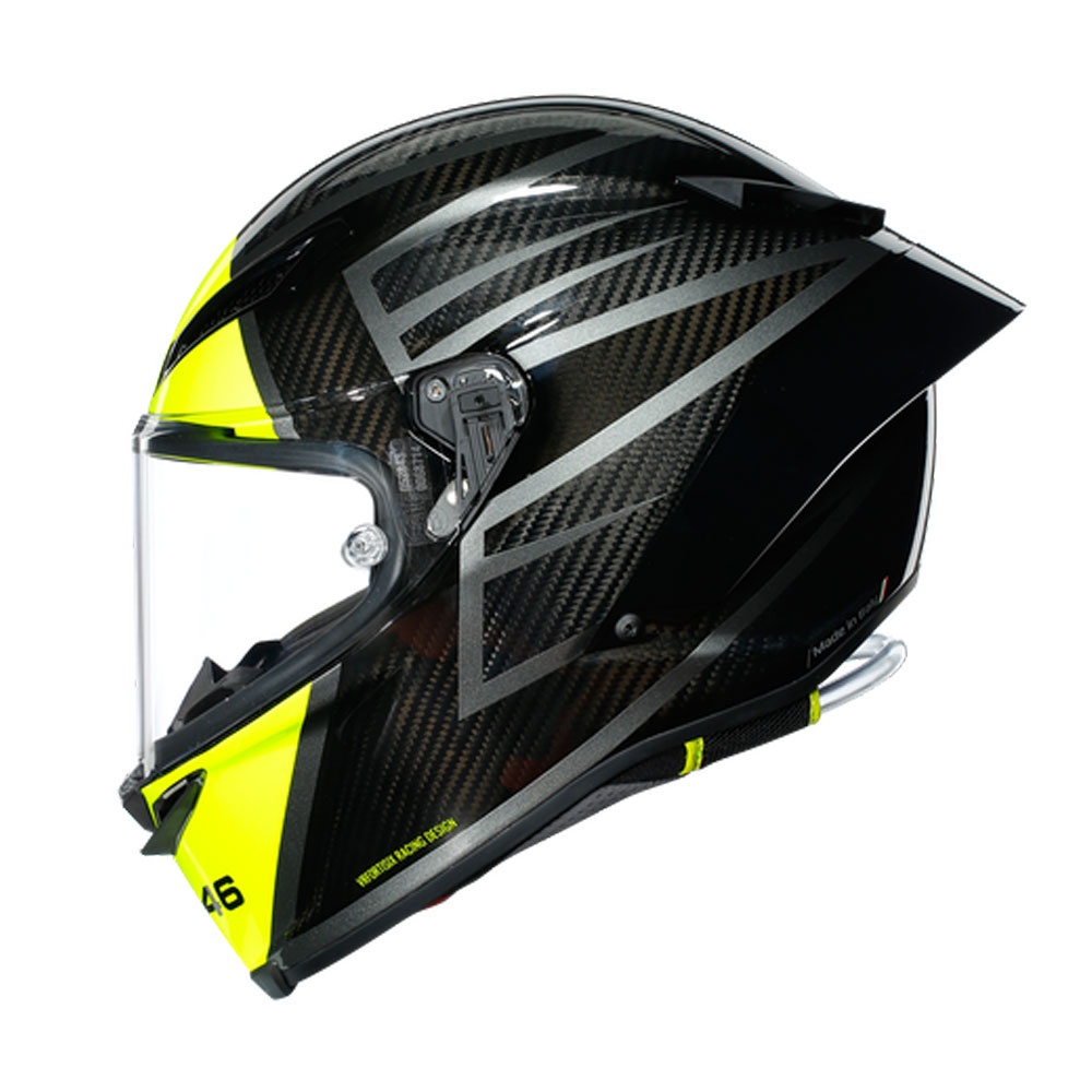 Pista GP RR is an exact replica of the AGV helmet used in races by professional world championship riders. It has therefore received FIM homologation, which certifies the highest possible level of protection, even against any dangerous twisting of the head. Every detail is designed to ensure ultimate performance. The Extreme Carbon shell in 100% carbon fiber guarantees extraordinary lightness, which make it effortless to wear. Its shapes and metal air vents are studied in the wind tunnel and tested by AGV athletes in order to ensure the best aerodynamic penetration and the greatest stability at high speeds, also as a result of the innovative profile of the rear PRO Spoiler. Boasting up to 5mm thickness, the optical class 1 Ultravision visor is an integral part of protection that enables 190° panoramic vision. This means the rider sees the track, adversaries, and obstacles more clearly, before anyone else. The exclusive 360° Adaptive Fit system allows for complete customization of the interior, giving the rider the possibility to select the ideal thickness for the upper part of the head, nape, and cheeks. Essential comfort that allows the rider to concentrate on the goal without distractions.