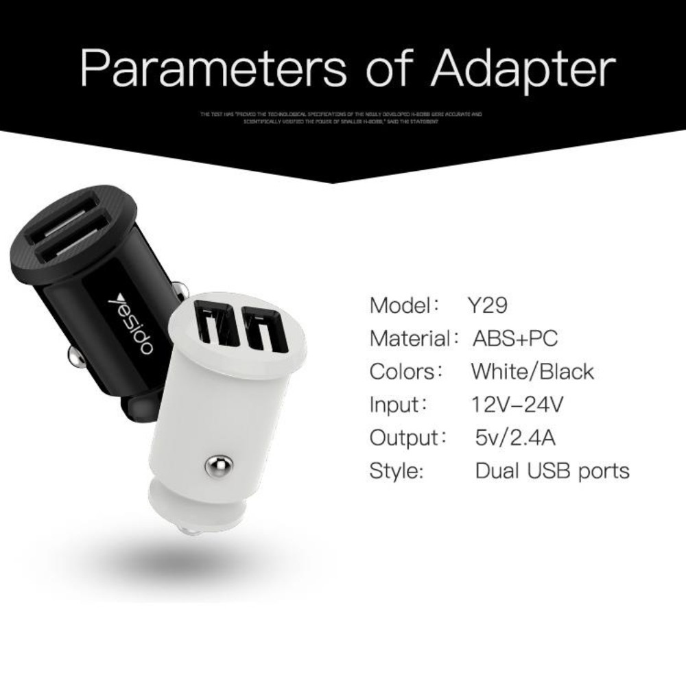 Елегантното и компактно зарядно устройство за кола YESIDO Y29 ви позволява да зареждате телефона си безопасно и бързо, докато шофирате. Просто го поставете в запалката на автомобила и се насладете на бързо зареждане (Quick Charge 2.4A) с два USB порта.