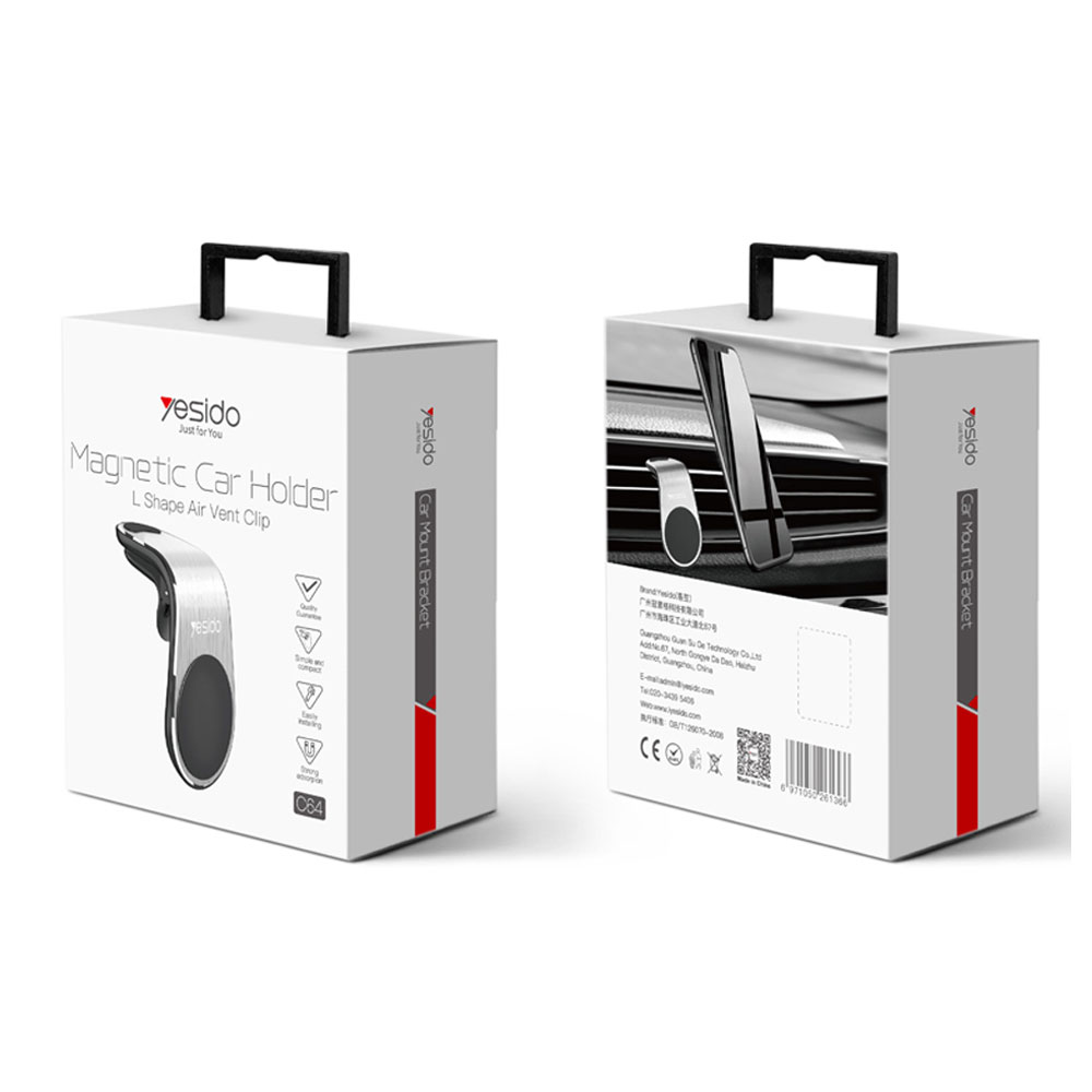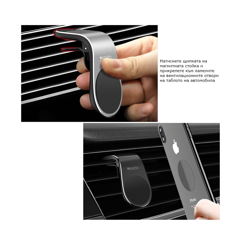 Елегантната алуминиева магнитна стойка YESIDO е идеалното решение за безопасно и удобно закрепване на мобилния телефон в автомобила. Монтира се лесно върху вентилационните отвори, като осигурява стабилно и сигурно захващане дори при неравен път или внезапно спиране.