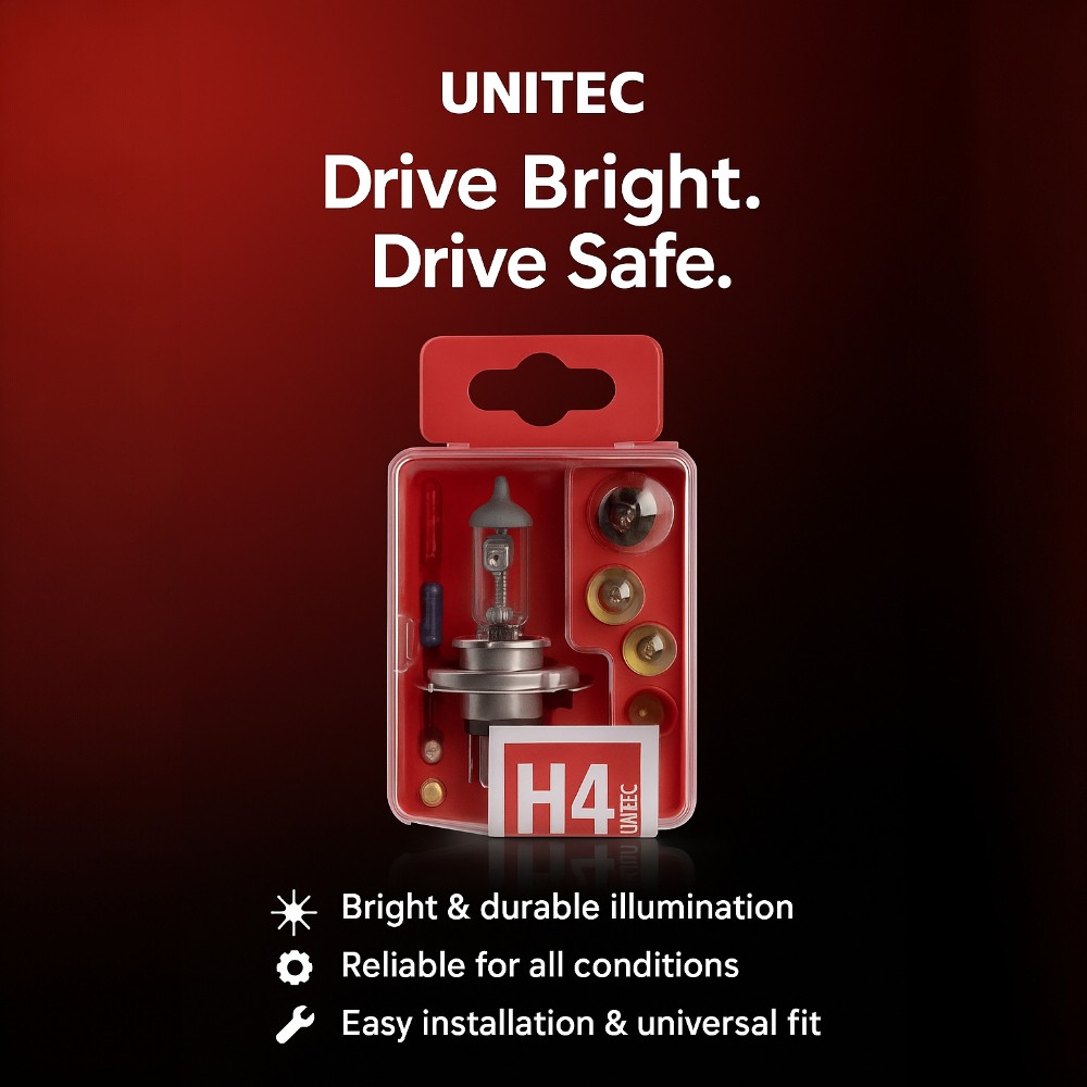 Комплектът UNITEC H4 съдържа основна крушка тип H4 и допълнителни крушки и предпазители за най-често срещаните нужди при път. Идеален за спешни случаи, технически прегледи или като резерв в багажника.