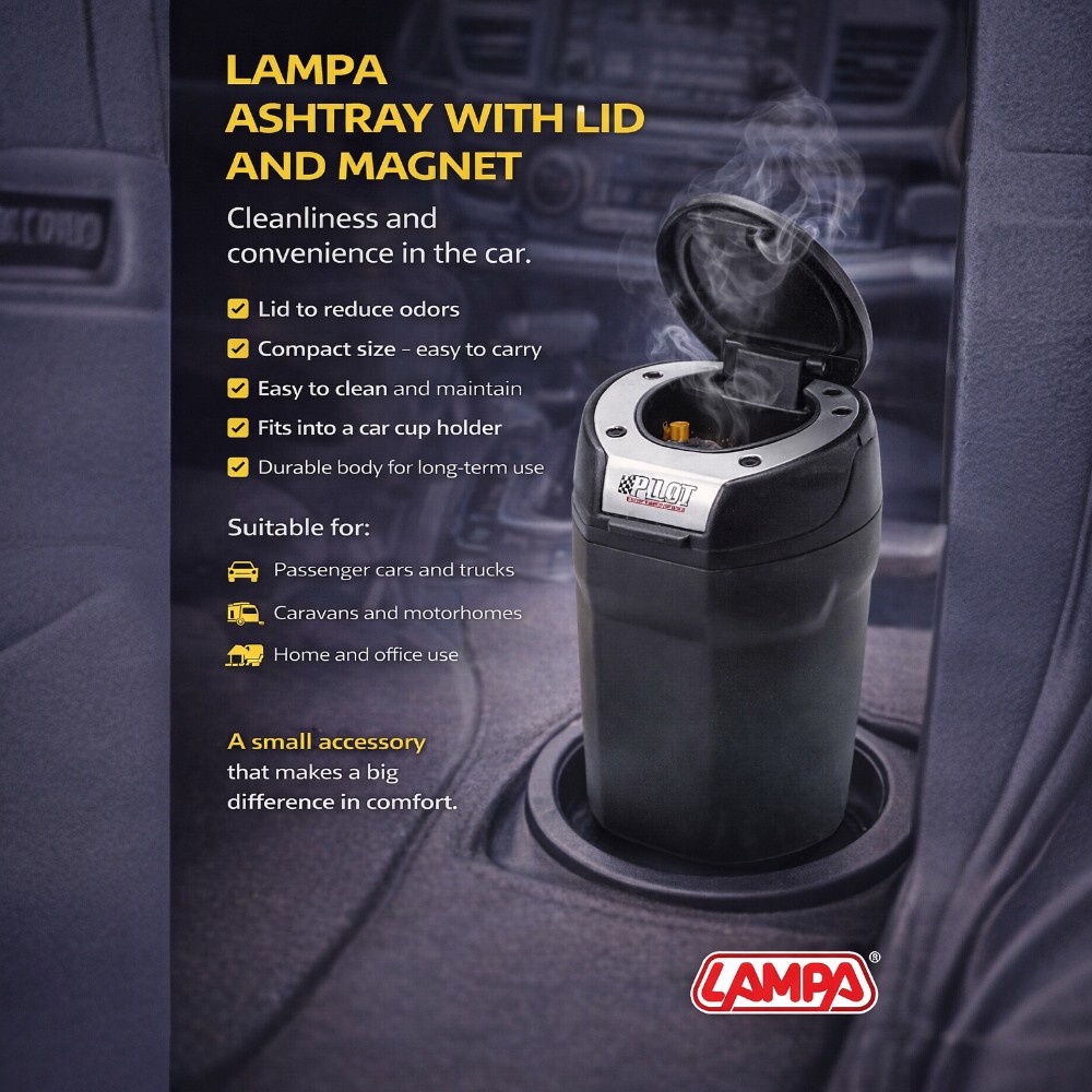 Пепелникът LAMPA е практичен и стилен аксесоар, който поддържа интериора чист и без неприятни миризми. Оборудван с капацитет за задържане на дима и вграден магнит за стабилно закрепване, той е удобен както за автомобила, така и за дома или офиса.