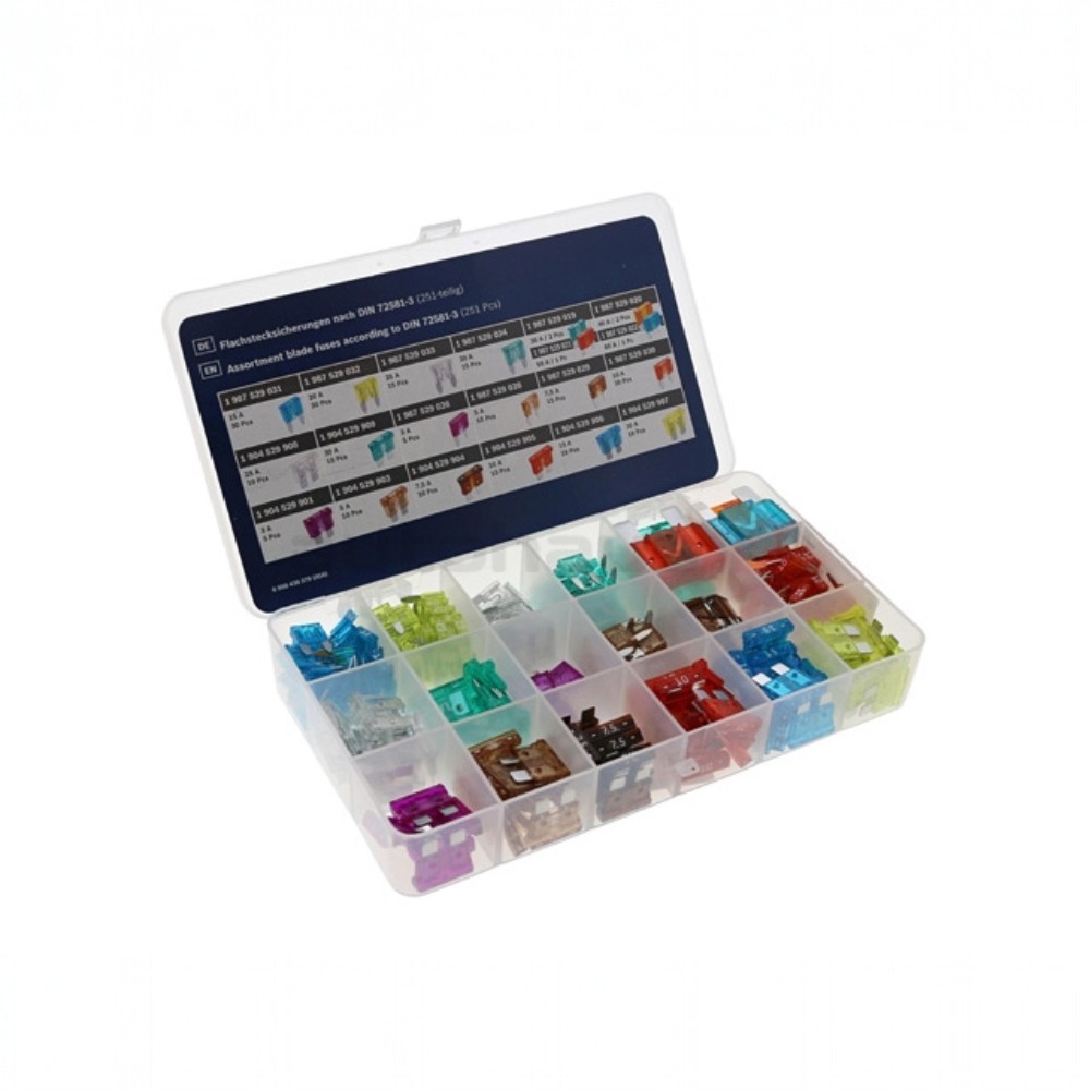 Оригинален комплект бушони BOSCH с 251 броя в практична пластмасова кутия. Съдържа най-често използваните mini, standard и maxi бушони, подредени по ампераж за бърз достъп.