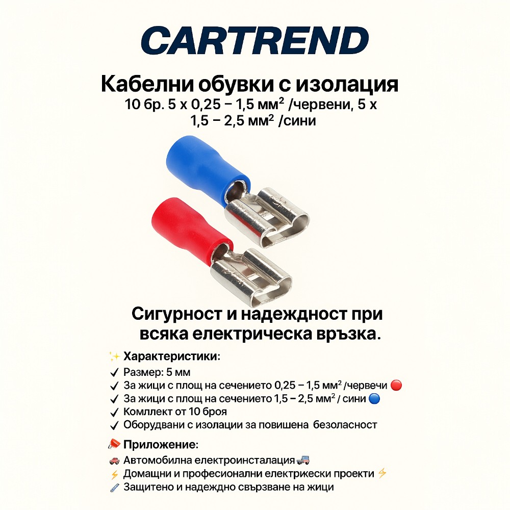 Надежден комплект кабелни обувки с изолация, осигуряващи стабилни и безопасни връзки при различни електрически инсталации. Подходящи за автомобили, дома и професионални приложения.