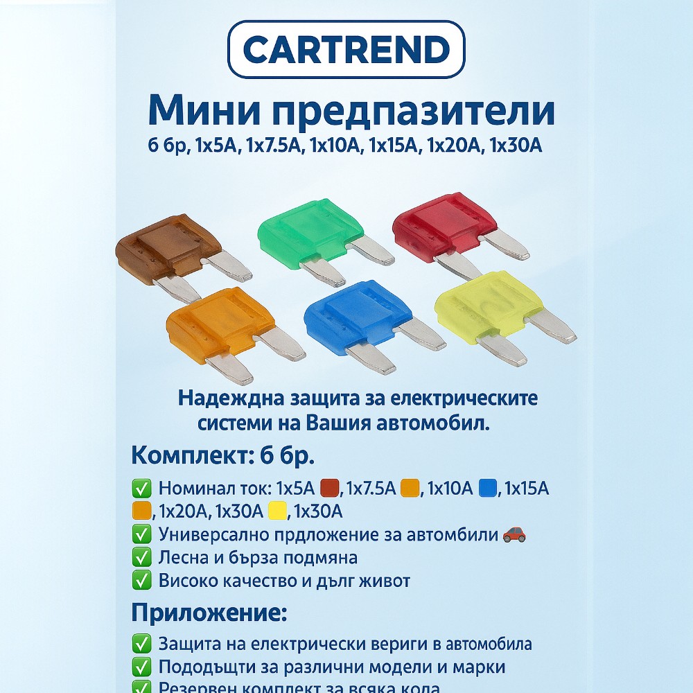Практичен комплект мини предпазители за автомобили, осигуряващи надеждна защита на електрическите вериги срещу претоварване и късо съединение. Идеален избор за резервен комплект във всяка кола. 🚗⚡