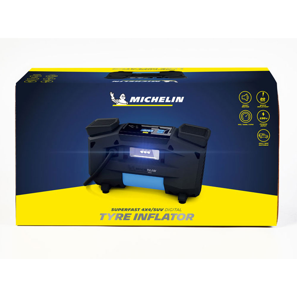 MICHELIN Superfast Digital Tyre Inflator 230V е високоефективен електрически компресор, създаден за бързо и точно напомпване на гуми с голям обем – идеален за SUV, 4×4, кемпери, каравани и бусове. Снабден с мощен 230V мотор и цифров контрол, този компресор осигурява професионално качество в домашни условия.