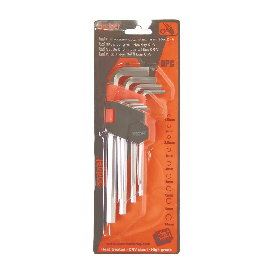 Комплектът шестограми Gadget включва 9 броя ключове с размери от 1.5 до 10 мм, изработени от висококачествена хром-ванадиева стомана (CR-V). Перфектни за монтаж и демонтаж на различни крепежни елементи с вътрешен шестостен.