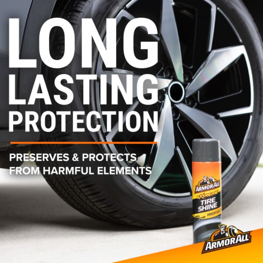 Спрей за екстремен блясък на гумите. придава интензивен огледален блясък и наситен черен вид, предлага се в удобен аерозолен спрей.
