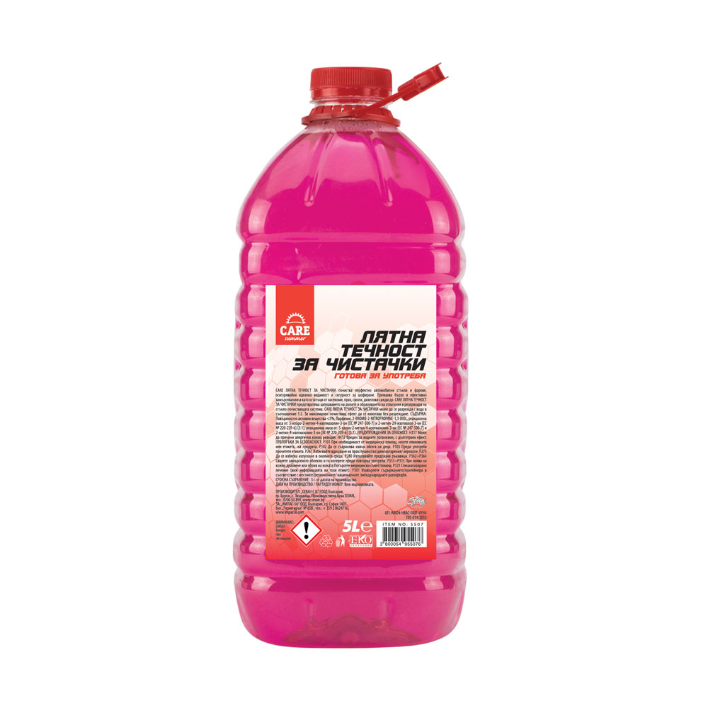 Премахва бързо и ефективно замърсяванията като остатъци от насекоми, прах, смоли, дизелови сажди др. CARE ЛЯТНА ТЕЧНОСТ ЗА ЧИСТАЧКИ предотвратява запушването на дюзите и образуването на отлагания в резервоара на стъклопочистващата система. Подходяща за поликарбонатни фарове и ветрилообразни дюзи. Удължава експлоатационния живот на стъклочистачките. CARE ЛЯТНА ТЕЧНОСТ ЗА ЧИСТАЧКИ може да се разрежда с вода в съотношение 1:2. За максимален почистващ ефект да се използва без разреждане.