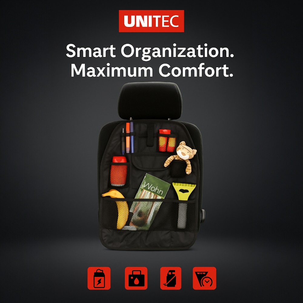 Органайзерът UNITEC се монтира лесно на задната част на предната седалка и осигурява практично място за съхранение на различни предмети – бутилки, играчки, зарядни, кърпички и други аксесоари.